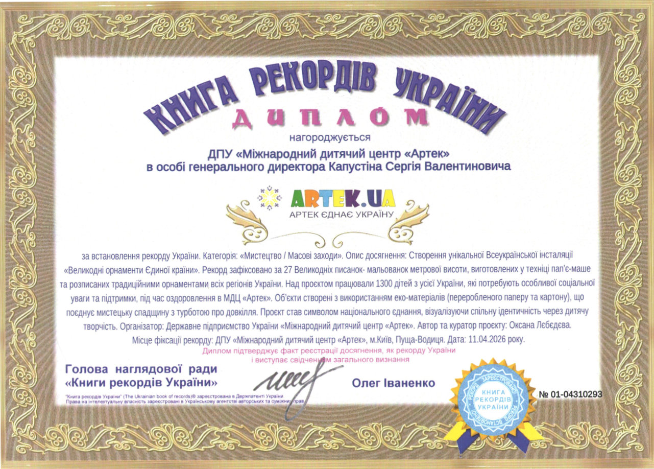 На тематичній зміні «Соціально-ціннісний проєкт «Світло добра» 11 квітня 2026 р. відбулося відкриття унікального всеукраїнського мистецького проєкту «Великодні орнаменти єдиної країни», створеного Культурно-мистецьким центром МДЦ «Артек». Як унікальну за масштабом всеукраїнську дитячу мистецьку інсталяцію проєкт зареєстровано в Книзі рекордів України. Зазначений артпроєкт не має аналогів в Україні: 27 великодніх писанок висотою один метр, створених у техніці пап’є-маше, відображають орнаменти всіх регіонів країни. Кожна писанка є візуальною історією окремого регіону, а разом вони формують цілісний образ єдності українського народу. Особливістю проєкту є те, що до його створення долучилися 1300 дітей з усіх куточків України, які перебували в дитячому центрі, а також художники та майстри декоративно-прикладного мистецтва Культурно-мистецького центру МДЦ «Артек».